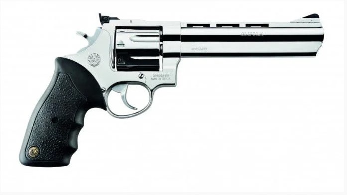 Revólver produzido com acabamento Inoxidado alto brilho e fosco, e capacidade de 8 tiros.